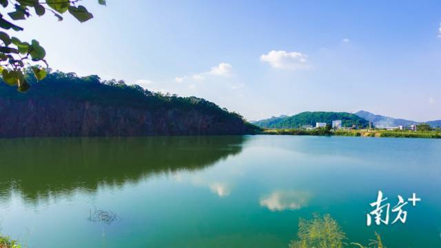 秋日午后,冲口村大矿坑在阳光照射下,水面泛起粼粼波光。一侧青山如屏,隔绝尘嚣,自成一片静谧秘境。